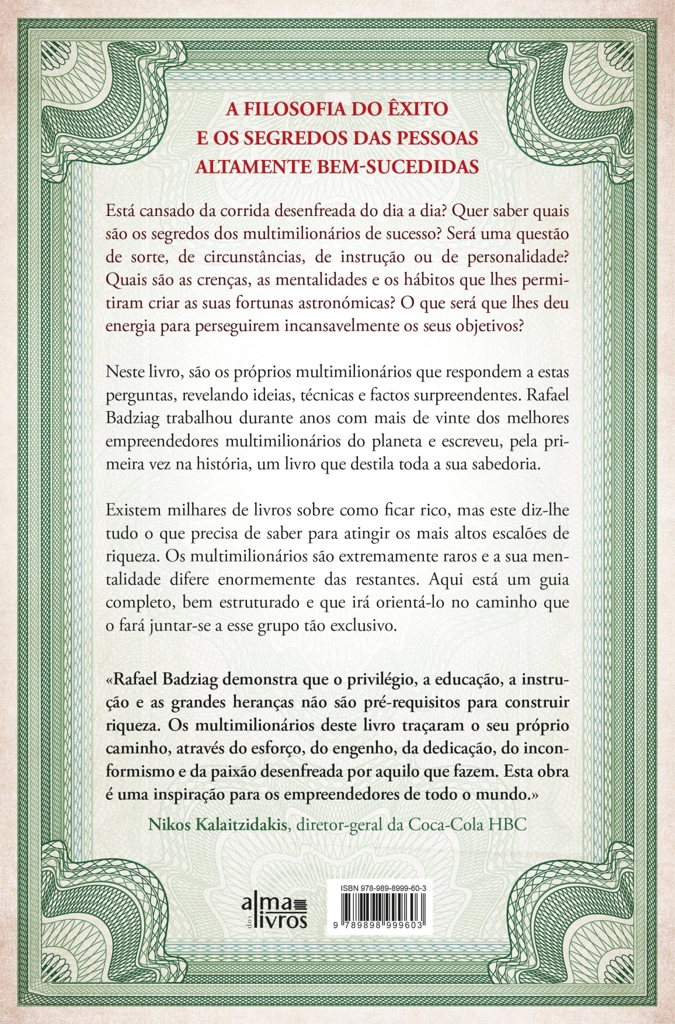 Neste livro, são os próprios multimilionários que respondem a todas estas perguntas, revelando ideias, técnicas e factos surpreendentes. Nunca antes ninguém entrevistou mais de vinte multimilionários em todo o mundo e escreveu um livro com toda a sua sabedoria. Rafael Badziag trabalhou durante anos com alguns dos melhores empreendedores do planeta e destilou nesta obra todos os segredos que lhes permitiram começar do zero e criar biliões.