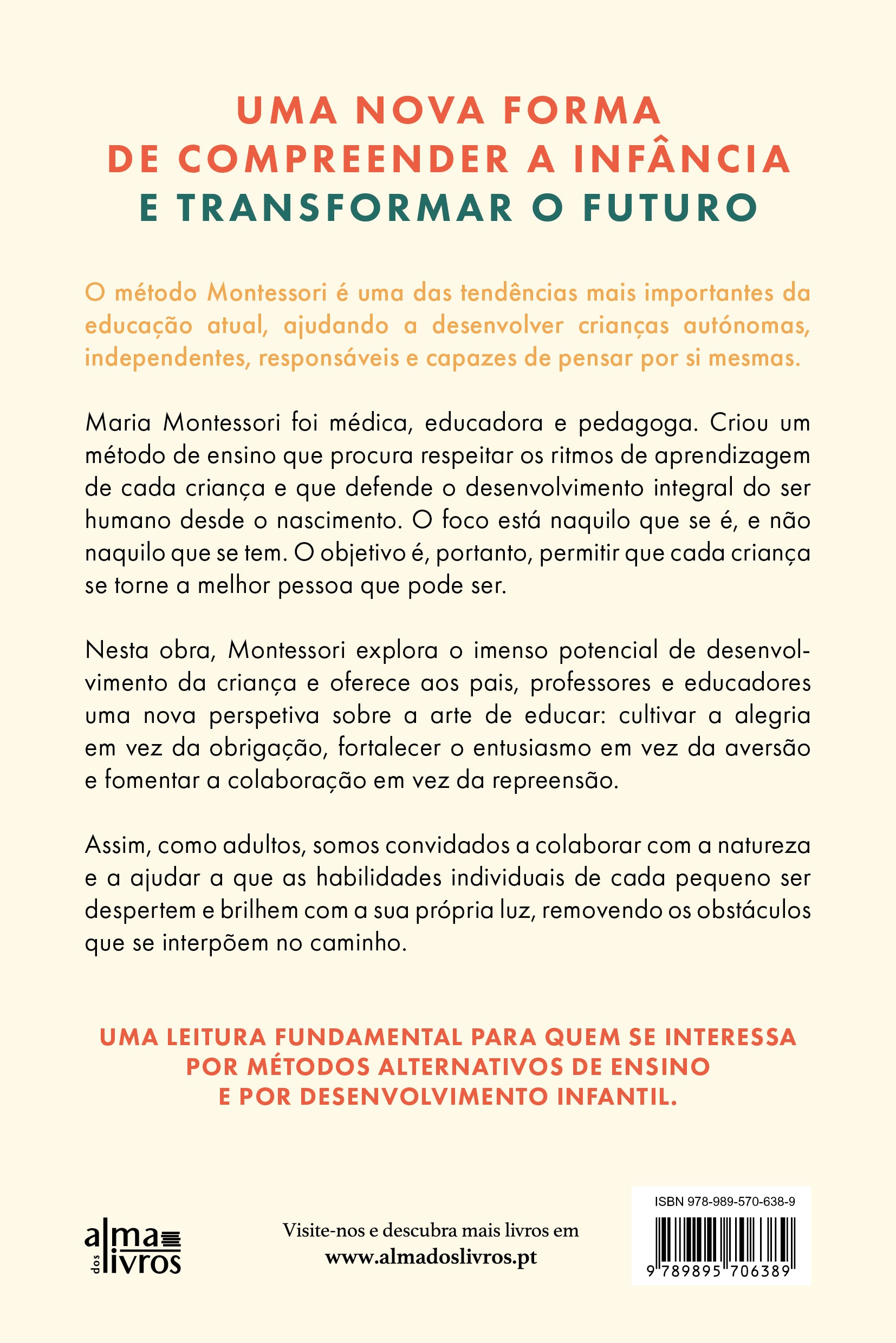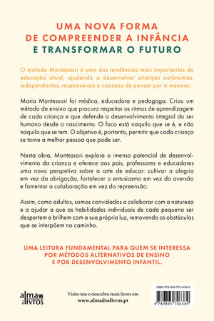 Nesta obra, Montessori explora o imenso potencial de desenvolvimento da criança e oferece aos pais, professores e educadores uma nova perspetiva sobre a arte de educar: cultivar a alegria em vez da obrigação, fortalecer o entusiasmo em vez da aversão e fomentar a colaboração em vez da repreensão.
